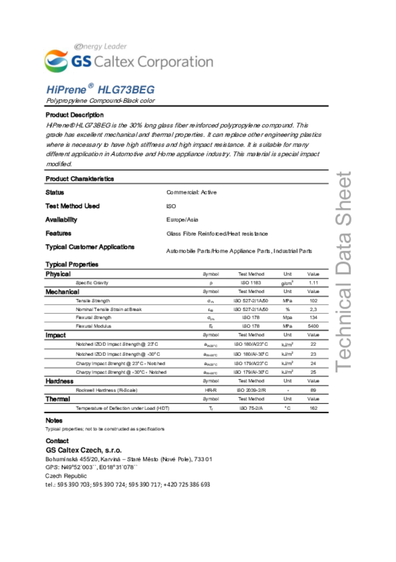 HiPrene® HLG73BEG ist die 30% lange glasfaserverstärkte Polypropylenverbindung. Diese Sorte hat ausgezeichnete mechanische und thermische Eigenschaften. Es kann andere technische Kunststoffe ersetzen, wenn dies für eine hohe Steifigkeit und Schlagfestigkeit erforderlich ist. Es eignet sich für viele verschiedene Anwendungen in der Automobil- und Haushaltsgeräteindustrie. Dieses Material ist speziell schlagzähmodifiziert.