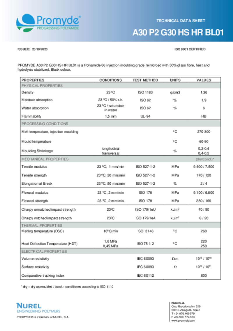 Polyamide 66 injection moulding grade reinforced with 30% glass fibre, heat and hydrolysis stabilized.