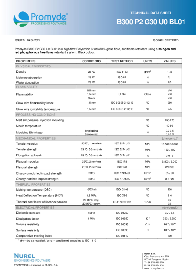 high flow Polyamide 6 with 30% glass fibre, and flame retardant using a halogen and red phosphorous free flame retardant system.