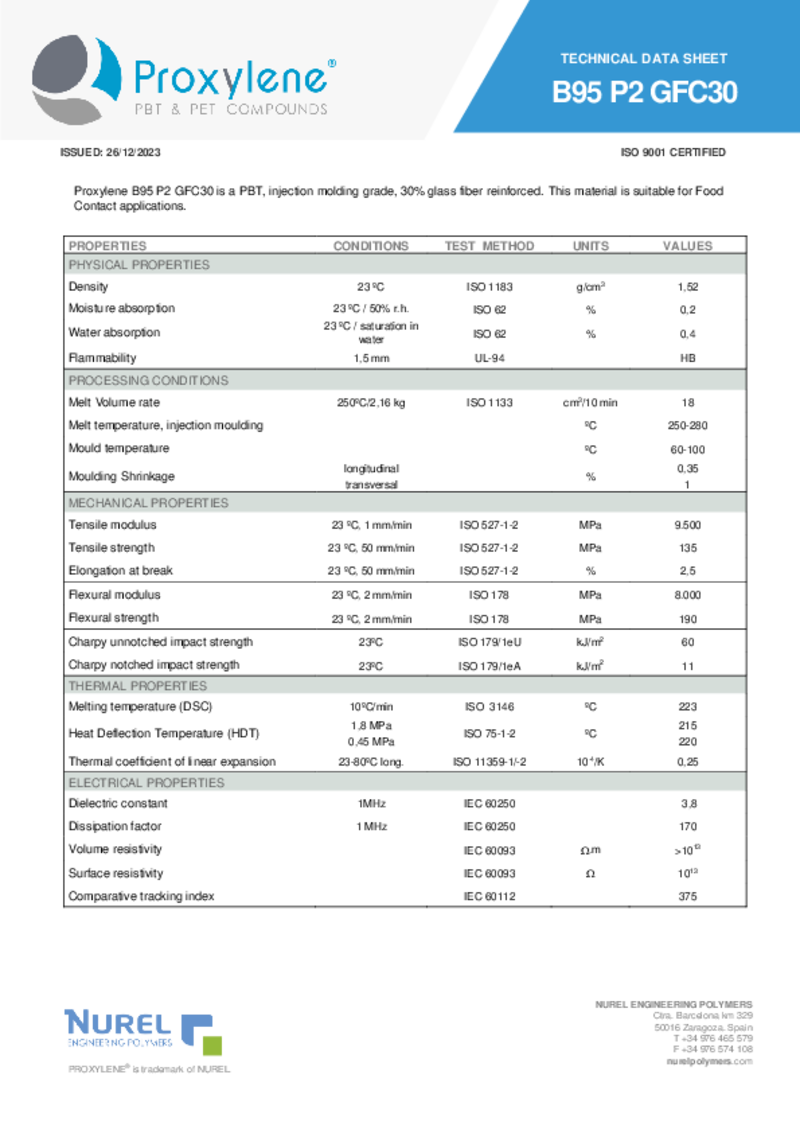mit 30% Glasfaserverstärkung für den Spritzguss. Dieses Material ist für Anwendungen mit Lebensmittelkontakt geeignet.